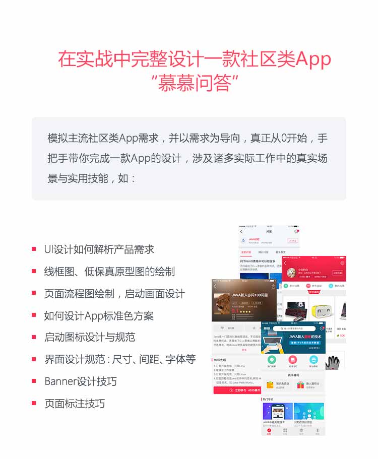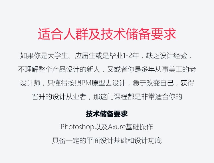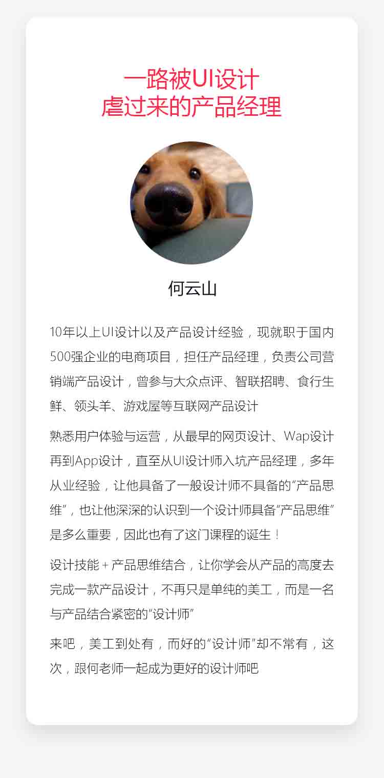 挺有收获值得一看! 优点:1、讲解产品的思路,分解页面和梳理流程,用线框图和原型图到结构图实现很完整,对交付成果很有帮助2、UI规范做得很好,细化完善页面很到位(整体协调相当好,不干巴 很赞!老师经验确实丰富,对用户体验把握相当好3、做BANNER有一定风险(高手在站酷),易被拍砖,但老师海报还挺好看 4、福利:pxcook(虽丑但快)cutterman(还行)感谢 缺点:1、秀PS技术稍多 估计讲课原因有保留快手秀 2、产品流程分解讲得太少,实际业务场景复杂很多,特别银行信贷和金融类,望能出这类案例 寄望:如何培养产品思维,怎样分解和完善流程,开枝散叶 福利:设计海报和BANNER,百看不厌
