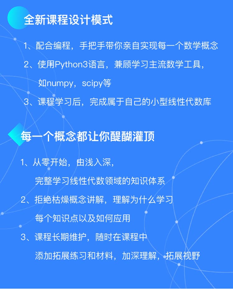 作为一个半路出家的程序员而言,为了学习数学知识,打好基础,把bobo的课都买了,从入门数据结构到这门线性代数,就个人而言,非常喜欢老师的讲解方式以及编排内容,也希望自己能够尽快填补自己的知识空缺。数学渣且基本忘了数学这门学科的工作党表示,这门课你值得拥有~~~