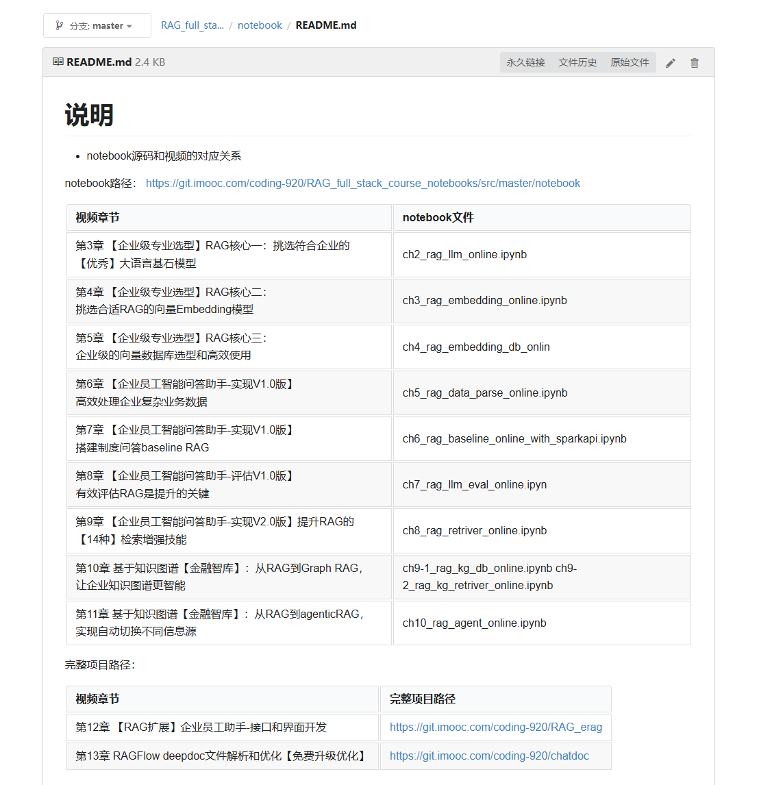 对于您的困扰表示抱歉。代码和章节已经更新到课程的git上了https://git.imooc.com/coding-920/RAG_full_stack_course_notebooks/src/master/notebook/README.md。