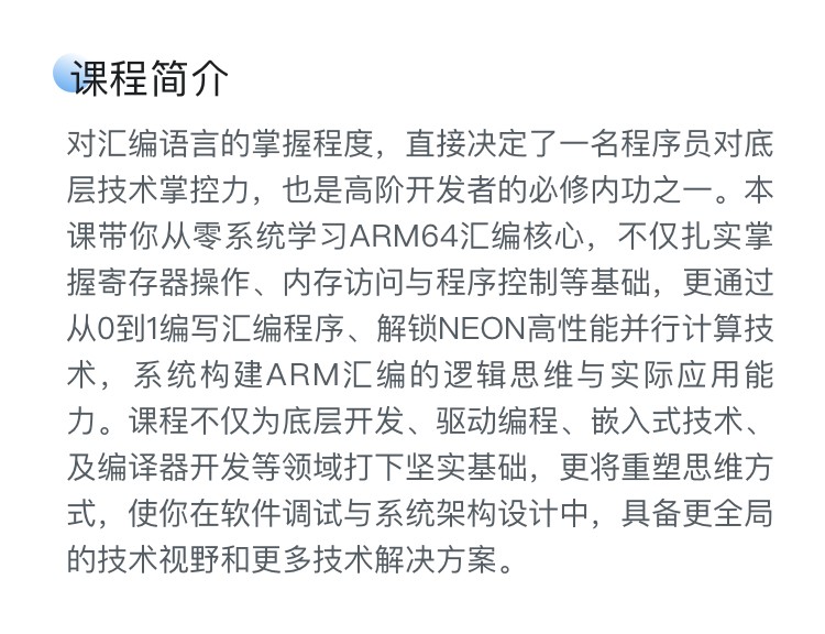 10 年一线大厂研发经验,深耕 C/C++、 精通 Java、Android 开发、Linux 应用层开发、ARM64 汇编及音视频领域核心技术,技术覆盖底层原理与上层应用。主导多个重点项目从 0 到 1 落地,全程把控架构设计、技术选型与落地交付,累计解决多起行业内疑难问题,能将实战案例与技术原理深度结合,助力学员快速掌握核心技能。