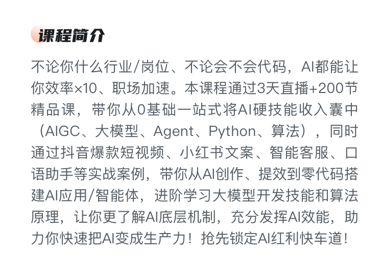 3天直播+200节精品课,0基础一站式解锁AI图文/视频创作、10+提效、零代码搭建智能体和算法