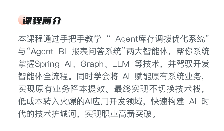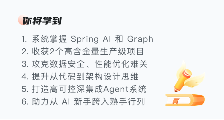 系统掌握 Spring AI+Graph+LLM 黄金技术栈,实现从 “不会” 到 “能落地” ,赋能原有业务 AI 提效